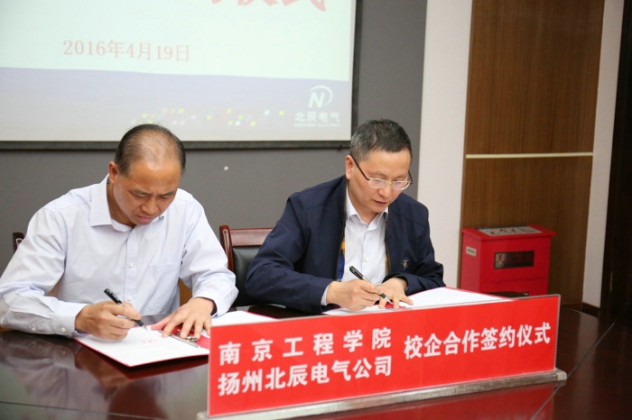 4月19日下午,“南京工程學(xué)院—揚州北辰電氣設(shè)備有限公司”校企合作簽字儀式、“南京工程學(xué)院教學(xué)實習(xí)基地”揭牌儀式,在北辰電氣公司舉行。校企合作協(xié)議的簽約,標(biāo)志著公司與南京工程學(xué)院就產(chǎn)學(xué)研、人才培養(yǎng)、繼續(xù)教育等方面達(dá)成戰(zhàn)略合作。南京工程學(xué)院黨委副書記、副院長陳德靜與揚州北辰電氣公司總經(jīng)理呂清源代表雙方簽約。學(xué)院及北辰公司相關(guān)領(lǐng)導(dǎo)參加了此次揭牌儀式。