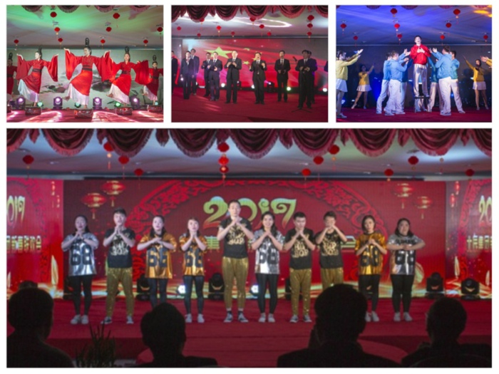 整個(gè)職工迎新春聯(lián)歡會(huì)氣氛活躍,12個(gè)節(jié)目均為職工自編自演,公司領(lǐng)導(dǎo)班子也參與其中。絢麗的舞臺(tái)異彩紛呈、變幻的光影美輪美奐、曼妙的舞步優(yōu)雅柔美、悠揚(yáng)的歌聲振奮人心。充滿朝氣的《中國(guó)龍鼓》、熱情洋溢的舞蹈《春節(jié)序曲》、清新柔美的舞蹈《水調(diào)歌頭》、古韻十足的舞蹈《漢唐風(fēng)》和《驚鴻舞》展現(xiàn)了北辰人對(duì)中華民族文化的繼承和發(fā)揚(yáng);青春歡快的歌舞劇《青春不只在指尖》、激情四射的舞蹈《bang bang bang》和經(jīng)典歌曲《my love》的演唱展現(xiàn)了北辰人團(tuán)結(jié)向上的青春正能量;表現(xiàn)創(chuàng)業(yè)艱辛的《一路有你》和振奮人心的合唱《壯志在我胸》更是展現(xiàn)了北辰人承前啟后、繼往開來(lái),朝著美好未來(lái)奮勇直前的精神。