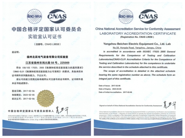 2017年2月6日,揚(yáng)州北辰電氣設(shè)備有限公司實(shí)驗(yàn)室獲得了中國合格評定國家認(rèn)可委員會(CNAS)頒發(fā)的實(shí)驗(yàn)室認(rèn)可證書。