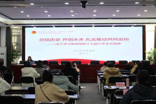 此次宣講會邀請了團市委青年宣講團成員陳雪兒講師為大家宣講,以“總結(jié)歷史 開創(chuàng)未來 扎實推動共同富?!睘橹黝},深入宣傳黨的十九屆六中全會精神。