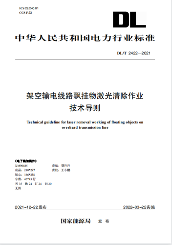 近日,公司首次參與起草的國家電力行業(yè)標(biāo)準(zhǔn)DL/T 2422—2021《架空輸電線路飄掛物激光清除作業(yè)技術(shù)導(dǎo)則》通過了國家能源局的批準(zhǔn)發(fā)布,并將于2022年3月22日正式實(shí)施。